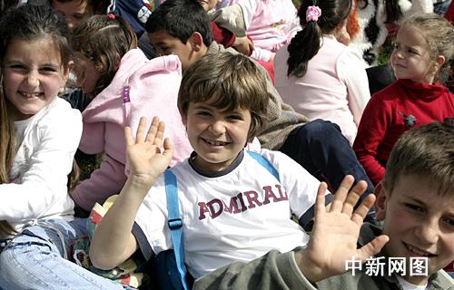 希臘當(dāng)?shù)貢r間3月24日,北京二00八年奧運(yùn)會圣火采集儀式在古奧林匹亞競技場舉行。希臘小觀眾坐在草坪上觀看采集儀式。 中新社記者 王歡