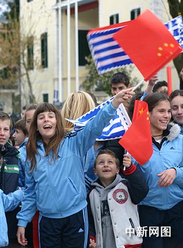 3月25日,北京2008年奧運(yùn)圣火希臘傳遞第二天,慶典儀式在終點(diǎn)約阿尼納舉行。市民高舉中國和希臘國旗歡迎北京奧運(yùn)圣火到來。中新社記者 王歡