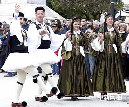 3月25日,北京2008年奧運圣火希臘傳遞第二天,慶典儀式在終點約阿尼納舉行。舞蹈演員們跳起民族舞蹈迎接北京奧運圣火。據(jù)悉,這種希臘非常著名的傳統(tǒng)舞蹈,只有在重大節(jié)日或儀式慶典的時候才會表演。中新社記者 王歡