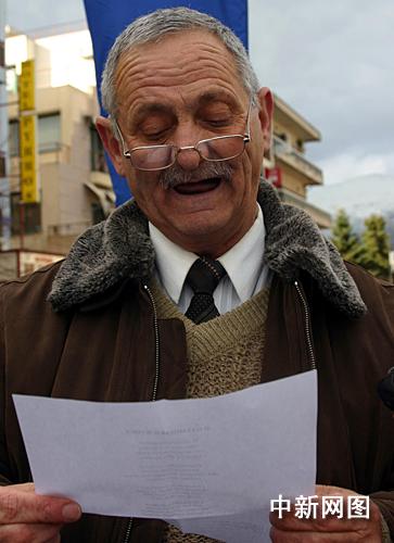 3月25日,北京2008年奧運(yùn)圣火希臘傳遞第二天,慶典儀式在終點(diǎn)約阿尼納舉行。一位當(dāng)?shù)乩险咴诶收b自己新近創(chuàng)作的贊美奧運(yùn)圣火的詩歌。 中新社記者 王歡