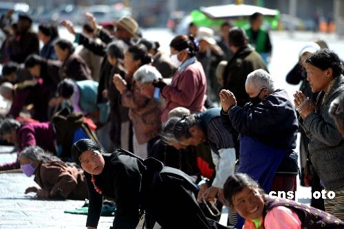 眾多信眾在布達(dá)拉宮廣場(chǎng)上叩首。中新社發(fā) 廖攀 攝