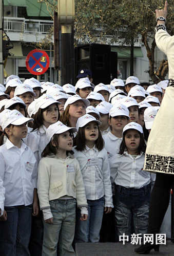 3月26日,北京奧運(yùn)會(huì)圣火希臘境內(nèi)傳遞第三日,抵達(dá)當(dāng)天最后一個(gè)城市韋里亞。當(dāng)?shù)貎和莩獖W林匹克會(huì)歌和希臘國歌。中新社記者 王歡