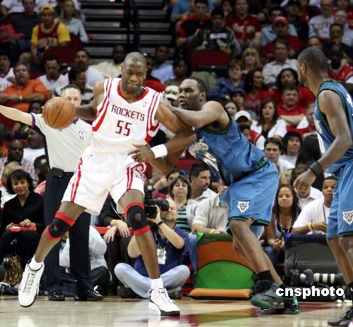3月26日晚,火箭主場(chǎng)迎戰(zhàn)森林狼,火箭隊(duì)將當(dāng)晚定位“穆托姆博致敬之夜”,以向這位NBA常青樹(shù)致敬,被中國(guó)媒體稱(chēng)為“穆大叔”的火箭隊(duì)55號(hào),當(dāng)晚取得了4分和8個(gè)籃板的成績(jī)。中新社發(fā) 楊晉升 攝