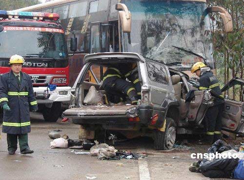三月二十七日六點四十分,廣西柳州市鹿寨縣寨沙鎮(zhèn)發(fā)生特大交通事故,一輛從貴州開往廣東的小車與一輛大客車迎面相撞,造成小車上包括司機在內(nèi)的六男四女共十人當場死亡,另外兩男子受重傷。中新社發(fā) 覃俊鋒 攝