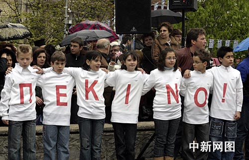 3月27日,北京奧運圣火希臘境內傳遞第四天,山城納烏薩迎來第一個慶典儀式。十幾個孩子的T恤上印有希臘字母,他們組成了“好運北京”。中新社記者:王歡