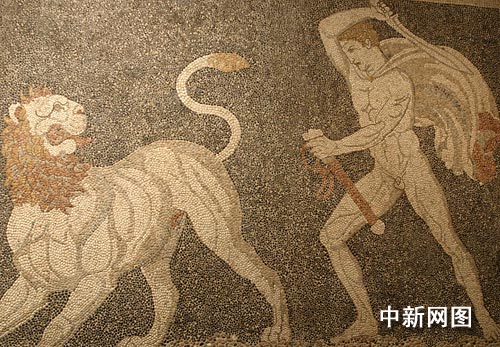3月27日,北京奧運(yùn)圣火希臘境內(nèi)傳遞第四天途徑派拉古城,博物館展出了部分發(fā)掘的歷史文物。圖為用細(xì)小的石子拼成的壁飾,名為“獵獅”。 中新社記者:王歡