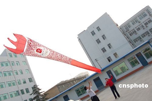 喜迎奧運圣火 “祥云火炬”風(fēng)箏濰坊試飛(5)
