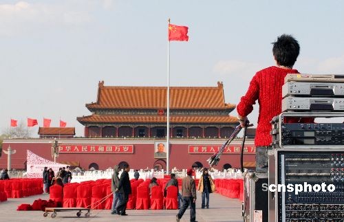 3月30日,工作人員在天安門廣場(chǎng)做搭建“奧運(yùn)圣火臺(tái)”的收尾工作、布置場(chǎng)地,迎接即將到來(lái)的2008年北京奧運(yùn)會(huì)圣火火種歡迎儀式。