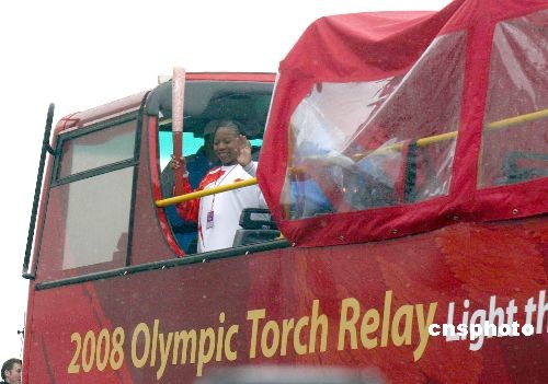 4月6日上午10時32分,倫敦大雪紛飛,獲得過五枚奧運(yùn)金牌的英國劃艇名將史蒂夫·瑞格夫手持祥云火炬穩(wěn)步跑出倫敦西北的溫布利體育場,北京奧運(yùn)圣火傳遞“和諧之旅”第四站隨之吹響號角。倫敦是北京奧運(yùn)圣火境外傳遞過程中,傳遞路線最長、最復(fù)雜的城市。約八個半小時的圣火傳遞,包括了輪船、自行車、敞篷公共汽車、輕軌等四種特殊傳遞方式。圖為第二棒火炬手乘坐具有倫敦特色的紅色雙層巴士離開溫布利體育場。中新社發(fā) 沈晨 攝