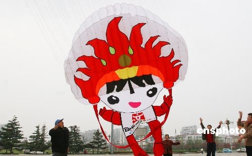 圖:山東濰坊巨型奧運福娃風(fēng)箏飛上天