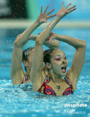 4月16日,“好運(yùn)北京”花樣游泳奧運(yùn)會(huì)資格賽在國(guó)家游泳中心拉開戰(zhàn)幕。在首日進(jìn)行的雙人技術(shù)自選的爭(zhēng)奪中,中國(guó)姐妹花蔣文文/蔣婷婷發(fā)揮出色,以95.500分位居第三。當(dāng)天兩位姐妹花的配樂(lè)是哈恰圖良的《馬刀舞曲》,這是姐妹倆第一次在正式比賽中使用該音樂(lè),這首音樂(lè)也將伴隨著她們出現(xiàn)在北京奧運(yùn)會(huì)的舞臺(tái)上。中新社發(fā) 富田 攝
