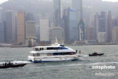 香港舉行北京奧運(yùn)火炬?zhèn)鬟f路線預(yù)演,維港海上數(shù)艘警用巡邏艇、快艇、護(hù)送火炬?zhèn)鬟f游輪過(guò)海,消防船在維港射水致意、飛機(jī)空中盤旋護(hù)駕。 王麗南 攝