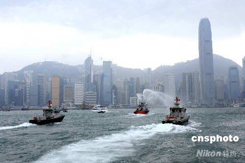 香港舉行北京奧運(yùn)火炬?zhèn)鬟f路線預(yù)演,維港海上數(shù)艘警用巡邏艇、快艇、護(hù)送火炬?zhèn)鬟f游輪過(guò)海,消防船在維港射水致意、飛機(jī)空中盤(pán)旋護(hù)駕。 王麗南 攝