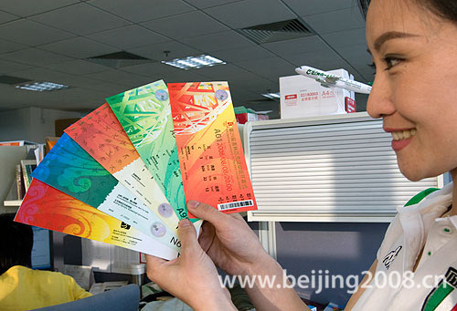 中新網(wǎng)4月23日電 北京時間今天上午,“北京奧運會第三階段票務銷售情況新聞發(fā)布會”在北京奧運新聞中心舉行。北京奧組委票務中心主任朱炎和北京奧運會奧運藝術(shù)中心主任王敏一起揭開了北京奧運會門票的票樣。