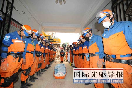 這是足以令每個(gè)中國(guó)人都為之震撼的一幕!5月17日早晨7點(diǎn)30分左右,四川青川縣喬莊鎮(zhèn)一處倒塌的六層樓廢墟旁,31名全副武裝的日本搜救隊(duì)員分成兩列,集體向兩名中國(guó)遇難者遺體默哀。經(jīng)過(guò)14個(gè)小時(shí)的努力,他們最終還是沒(méi)能挽回這兩條年輕的生命——一名27歲的女性宋雪梅和她剛出生75天的女兒。