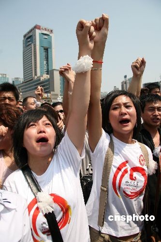 5月19日14時(shí)28分,成都天府廣場(chǎng),數(shù)以萬計(jì)的民眾自發(fā)聚集在一起默哀,為在四川汶川地震中遇難的同胞哀悼、祈禱,之后,萬人高喊“雄起”!