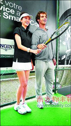 當(dāng)天,主辦單位安排現(xiàn)年19歲、目前法國(guó)排名第一的網(wǎng)球選手RichardGasquet教林志玲發(fā)球,“師徒”兩人剛見(jiàn)面,沒(méi)打過(guò)網(wǎng)球的林志玲就羞紅了臉。師傅教她握拍、開(kāi)球,善打羽毛球的林志玲以羽毛球動(dòng)作開(kāi)球,“花拳繡腿”地?fù)]拍接球,接連幾球都將球砸向攝影師,她俏皮地頻吐舌頭道歉。(祁玲)