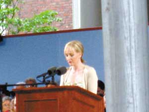 6月5日14時(shí)30分,繼上午的學(xué)位頒發(fā)儀式結(jié)束之后,哈佛大學(xué)的畢業(yè)慶典儀式繼續(xù)進(jìn)行,而其中的重頭戲就是《哈利·波特》作者J·K·羅琳的演講。盡管下著毛毛細(xì)雨,擺了兩萬(wàn)多把椅子的哈佛園(Havard Yard,哈佛主校區(qū))仍然座無(wú)虛席。參加慶典的學(xué)生親友中,不乏表情雀躍的小朋友。身穿淺色花裙、外著米色外套、手握紅色坤包的羅琳甫一出現(xiàn),全場(chǎng)便一陣騷動(dòng),并響起了長(zhǎng)時(shí)間的掌聲。