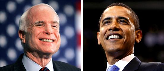 美國(guó)共和黨總統(tǒng)競(jìng)選人麥凱恩(左)與民主黨總統(tǒng)競(jìng)選人奧巴馬(右)。