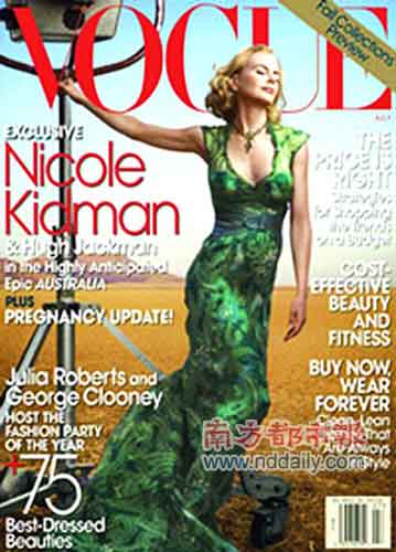妮可·基曼(NicoleKidman)帶著她的新作《澳大利亞》(Australia)登上了今年7月號(hào)的《Vogue》雜志(見(jiàn)上圖),整整16頁(yè)的照片專版讓人驚艷地摒住呼吸。不用懷疑,這又是攝影大師安妮·萊博維茨(AnnieLeibovitz)的作品,電影般的華麗畫面、油畫般的細(xì)膩精致全部集中在她最新出爐的這組照片中。