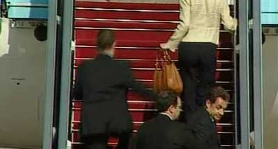 槍響之時(shí),軍樂(lè)儀隊(duì)正在表演,賓主顯然都未聽(tīng)到槍聲。身著暗色勁裝的男子迅即掩護(hù)薩科齊和妻子登上飛機(jī)扶梯。在慌亂中,薩科齊的妻子布呂尼花容失色,搶在丈夫前頭登機(jī)。