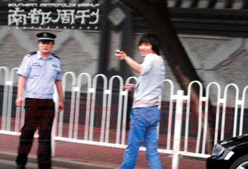 張亞?wèn)|下車一邊向警察說(shuō)著什么,一邊含笑指著記者的汽車。