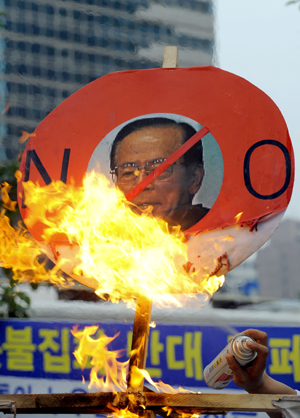 與來自民間的反對聲浪相比,韓國政府十天里也動作頻頻。除14日當(dāng)天李明博通過發(fā)言人“深表遺憾”,并指示政府“嚴(yán)正對待”外,韓國外交部立即召見日本駐韓大使要求其“糾錯”,并命令韓駐日大使迅速回國。韓國教育科技部也向日本文部科學(xué)省發(fā)去了抗議書。韓國各地方政府則陸續(xù)中斷了同日本的交流。