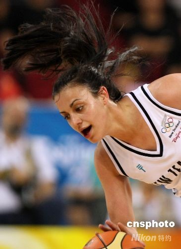8月13日下午,中國女籃在北京奧運會籃球小組賽第三輪的關(guān)鍵比賽中以80比63戰(zhàn)勝新西蘭隊,小組出線已成定局。新西蘭隊身高1.66米的后衛(wèi)安吉拉-瑪莉諾雖然身高最矮,但一頭烏發(fā)卻讓所有的女籃姑娘望塵莫及,當(dāng)她運球奔跑時,長發(fā)飄飄獨具一格。中新社發(fā) 任晨鳴 攝