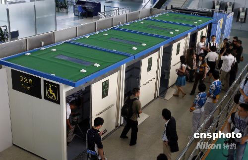 圖為2號(hào)航站樓01號(hào)遠(yuǎn)機(jī)位大棚加裝的臨時(shí)無(wú)障礙衛(wèi)生間。中新社發(fā) 杜洋 攝