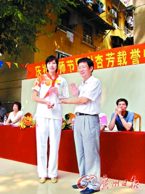 闊別母校20年,廣州籍羽毛球世界冠軍謝杏芳昨天來到濱江中第一小學,與全校400多名師生共慶教師節(jié)。由于還要到廣東隊參加常規(guī)訓練,謝杏芳在母校僅逗留了一個小時。為了歡迎這位冠軍校友的到來,全校師生早在中午就準備就緒。下午2時,謝杏芳步入母校,學生代表為阿芳系上紅領(lǐng)巾,這讓她回想起當年在這里就讀的點點滴滴,“我記得當年忘記戴紅領(lǐng)巾上學,于是只好躲在校門外等其他同學‘搭救’!