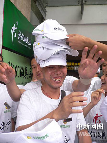 當(dāng)更多的人聽說這個消息后,爭相聚攏過來,把頭上的帽子一層層戴在徐先生的頭上,上面戴不住了,又往徐先生的懷里送。外層的志愿者們眼看擠不上去,就干脆把帽子扔向徐先生。懷里抱著一堆帽子,頭上頂著幾層帽子,徐先生樂開了花。