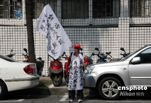 圖為一名臺(tái)灣民眾今早在臺(tái)北地方法院正門對(duì)面“嗆扁”。中新社發(fā) 陳立宇 攝