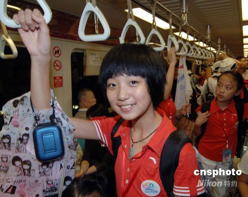福建小營員乘坐臺(tái)北捷運(yùn)、快樂體驗(yàn)臺(tái)北捷運(yùn)。中新社發(fā) 劉可耕 攝