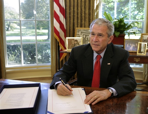在去財(cái)政部探望了那里的工作人員,并鼓舞他們的士氣后,布什回到他白宮的橢圓形辦公室,簽署了這個(gè)史上規(guī)模最宏大的救市法案。他還特地邀請(qǐng)了各大媒體的攝影記者,記錄下這歷史一刻。