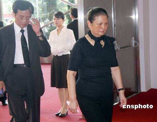 臺塑企業(yè)創(chuàng)辦人王永慶的遺體十七日由長榮班機(jī)運(yùn)抵臺灣,靈堂設(shè)在桃園縣的長庚大學(xué)活動中心。圖為王永慶的夫人李寶珠步入靈堂。中新社發(fā) 耿軍 攝