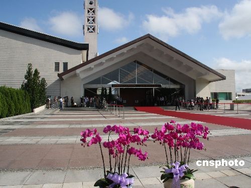 臺塑企業(yè)創(chuàng)辦人王永慶的遺體十七日由長榮班機運抵臺灣,靈堂設在桃園縣的長庚大學活動中心。圖為靈堂外景。中新社發(fā) 耿軍 攝