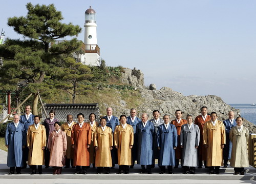 2005年APEC峰會在韓國釜山舉行,韓式大褂“圖魯馬吉”是此屆峰會的領(lǐng)袖服裝。