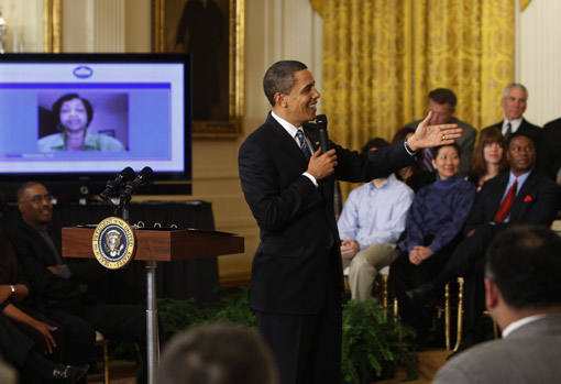 奧巴馬當日在白宮首次以網(wǎng)絡視頻方式回答網(wǎng)友及現(xiàn)場民眾代表的提問。就業(yè)、醫(yī)療、教育、房貸等民生問題是當日奧巴馬網(wǎng)絡答疑的重點。