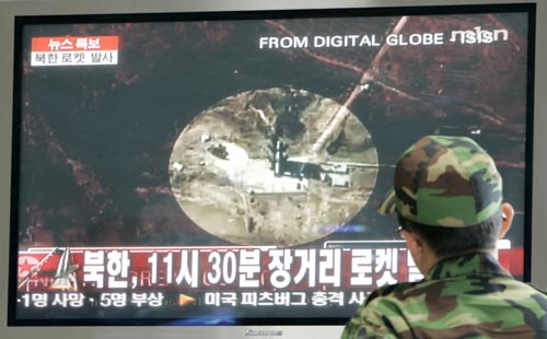 當(dāng)天,首爾站、長(zhǎng)途客運(yùn)站和地鐵站等處的電視機(jī)前聚集了很多市民,電視上正播出朝鮮發(fā)射火箭的消息,每位市民都顯得憂(yōu)心忡忡。