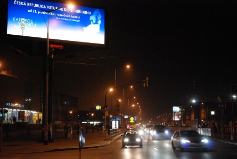 圖為捷克首都布拉格北面通向德國方向的交通要道一個路口上矗立的巨大廣告牌。設(shè)計者把捷文“穿行歐洲之路暢通無阻” 三個單詞中的字母“O” 巧妙地變成交通信號燈,而且三盞燈全是綠燈,喜悅之情躍然牌上。(黃頻)