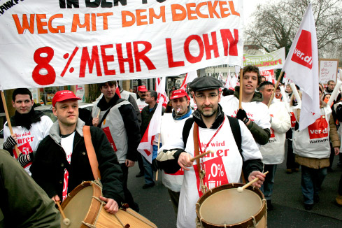 上周四在波茨坦進(jìn)行的最后一輪勞資談判最后宣告破裂,工會隨即醞釀罷工。此次罷工的目的是要求大幅提高工資。工會要求為聯(lián)邦和市鎮(zhèn)機(jī)關(guān)130萬公務(wù)員一年提高工資8%,或者起碼每月漲工資200歐元,但是資方卻提出兩年內(nèi)分3個階段漲5%的條件,而且同時還要求延長工作時間。