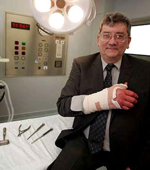 他憶述說:“我用了三十秒左右催眠自己,之后便全身都失去了知覺,除了(右)臂。我感覺到手術(shù)師為我做推拿──然后便聽見骨頭裂開的聲音。我聽見他說,‘可以拿那把鋸子給我嗎?’,然后我想象出他手中持著那把大得可以的東西。不過幸好他接著說:‘我想我們要用那把較小的器具!欢葘ξ矣皱N又鑿,我當時聽見一段反復(fù)錘擊的聲響。他對助手和麻醉師說的話都給我聽見了,不過他們沒說什么閑言?上О々ぉの疫以為可以聽到些刺激的東西呢!眰悇P伊現(xiàn)正在妻子陪同下在家休養(yǎng)。