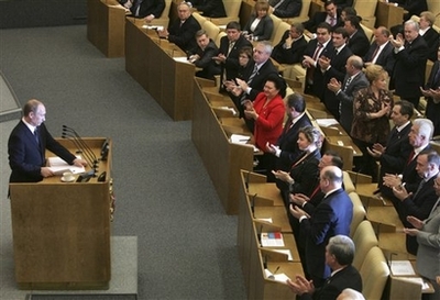 普京當(dāng)日在國家杜馬發(fā)表演說,闡述他在經(jīng)濟(jì)和軍事方面的施政要點(diǎn)。