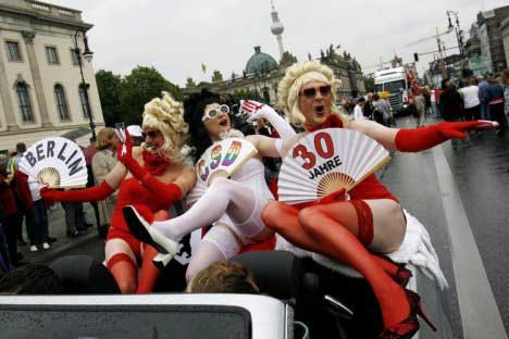 據(jù)報道,在德國首都柏林和法國首都巴黎分別都有50萬人參加了“同性戀者驕傲大游行”。游行聲勢盛大但氣氛平和,沒有騷亂和沖突的報道。