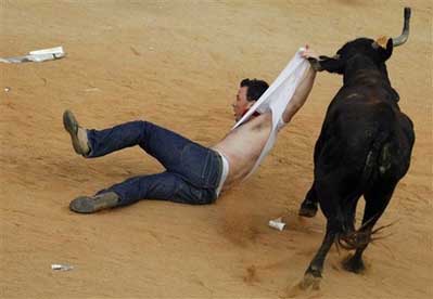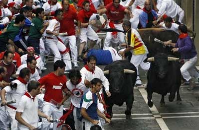 為期9天的奔牛節(jié),于6日早晨開始,人們把公牛趕到一起,在街上狂奔;人們傾巢而出,充塞街頭,最后跑向斗牛場,與牛共舞。