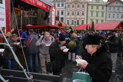 據(jù)報道,今年分發(fā)魚湯的份比去年增加了1/4,共分發(fā)了500份。前來喝湯的除了無家可歸的流浪者、領退休金者之外,不乏普通居民和好奇的外國游客。10年前創(chuàng)辦這項分發(fā)平安夜魚湯慈善活動的前布拉格市長揚.構卡爾今年又來為大家分湯。(黃頻攝影報道)