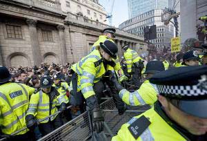 據(jù)英國(guó)《獨(dú)立報(bào)》報(bào)道,在G20峰會(huì)即將召開(kāi)的前夕,大批示威者涌上倫敦街頭,其中一些人甚至拿起了棍棒,同警察發(fā)生了肢體沖突。英國(guó)央行遭圍堵,蘇格蘭皇家銀行的辦公設(shè)備被砸爛,趨向暴力的抗議活動(dòng)已經(jīng)令倫敦亂作一團(tuán)。