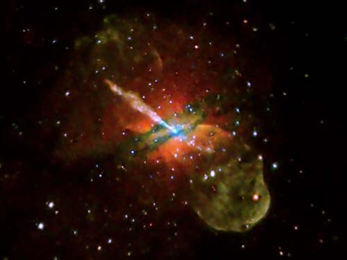 圖片中的左上角是一條延伸距離達(dá)1.3萬光年的X射線噴射物,以及一條向反方向延伸的較短的“反向噴射”。天文學(xué)家認(rèn)為,這種動力射流起到了重要的運輸作用,把來自黑洞的能量傳遞到規(guī)模更大的星系,同時還影響那里恒星的速度。