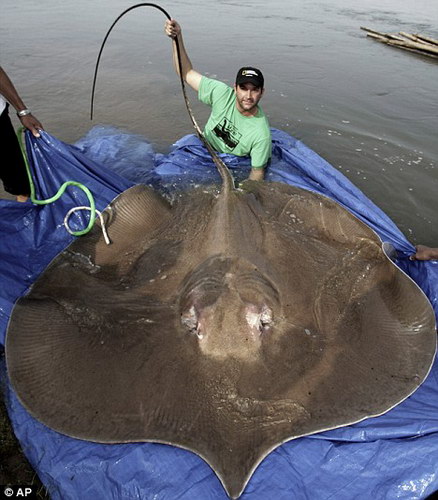 據(jù)英國媒體7月21日報道,現(xiàn)年34歲的美國生物學(xué)家扎布-霍根在柬埔寨Maeklong河中捕獲了一條長達4.27米的巨型黃貂魚,根據(jù)測量這個大家伙竟是已知世界上最大的淡水魚類。
