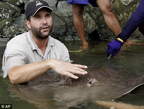 生物學(xué)家在介紹這條世界最大黃貂魚。